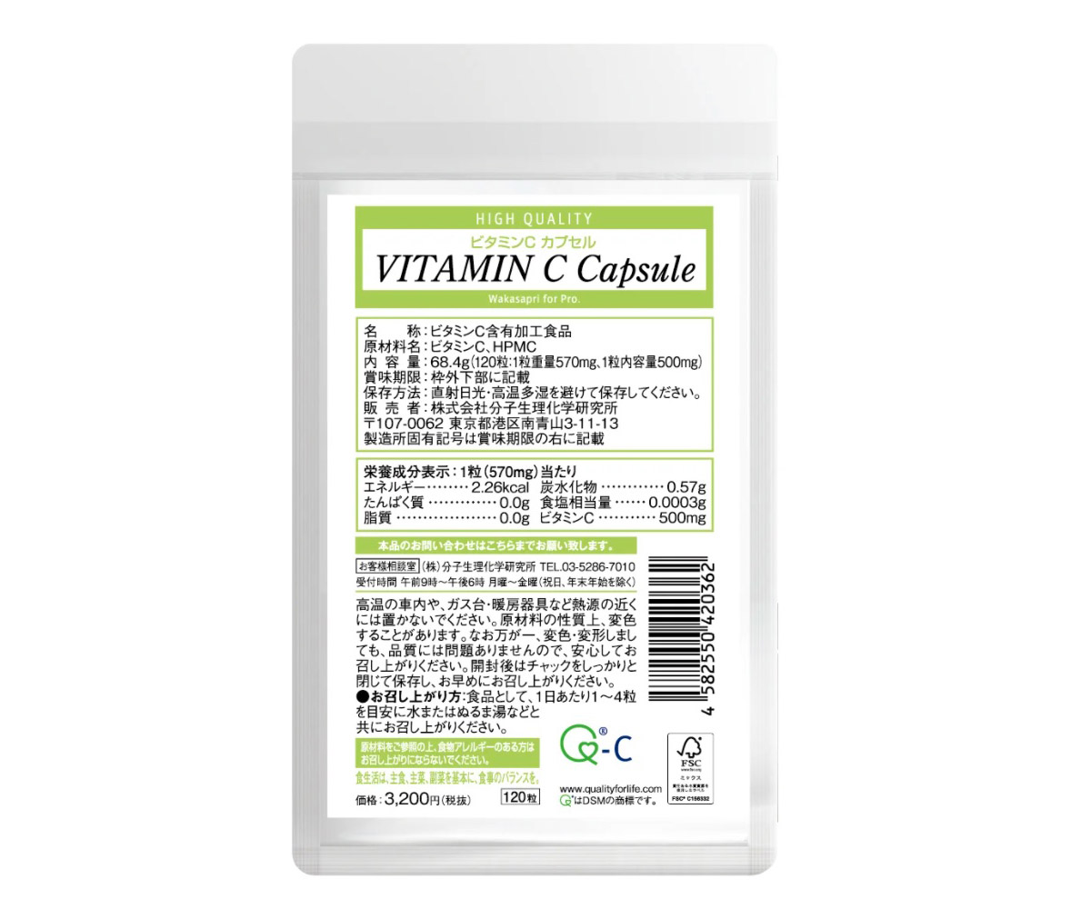 - 世界で流通するビタミンCはその90%以上を中国での製造に依存しています。本製品はDSM社(英国)の厳格な品質管理のもと製造された、トウモロコシ由来のビタミンC「Quali-C®」のみを使用し製品化しました。 市販されるビタミンCサプリメントの多くは、賦形剤と呼ばれる添加物を10%~60%程度使用し製品化されます。 本製品は、新たな技術により、賦形剤を一切使用せず、植物性カプセルに純粋なイギリス産ビタミンCを500mg配合した製品です。「酸っぱいのが苦手」「1日の摂取量を調整したい」という方におすすめの製品です。