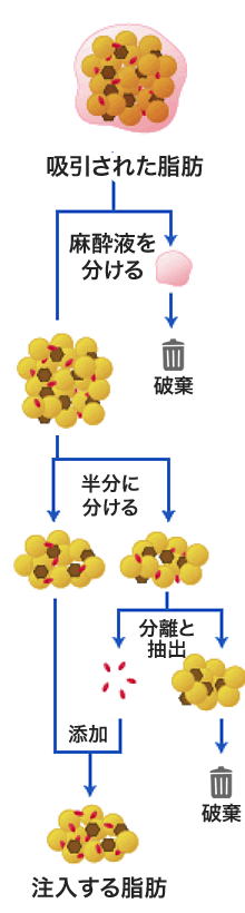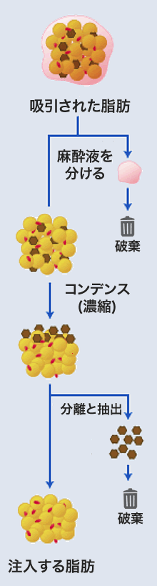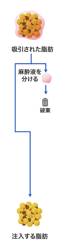 脂肪吸引で採取した脂肪をそのまま注入しても、脂肪細胞のサイズが違ったり、不純物が残っていて純粋に脂肪だけではない場合、定着率が下がり高い効果を見込むことはできません。