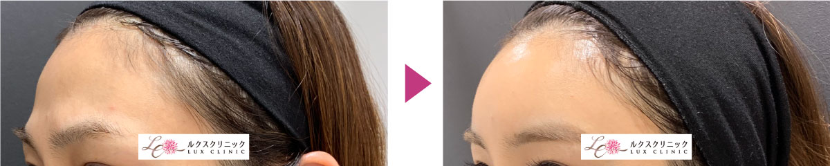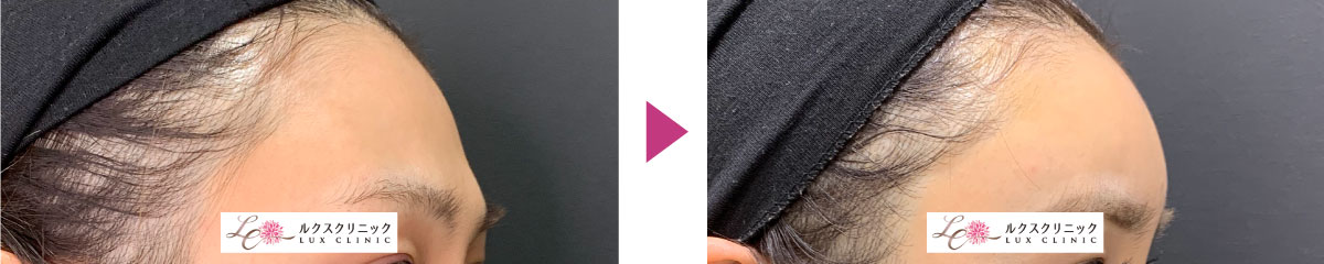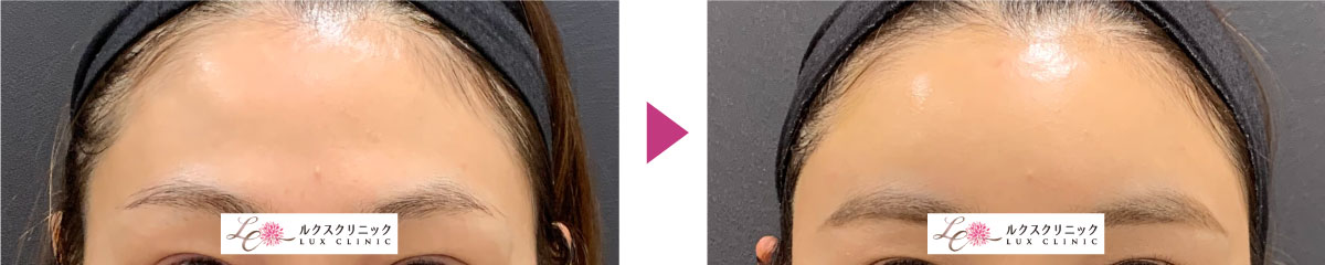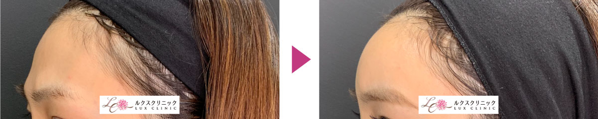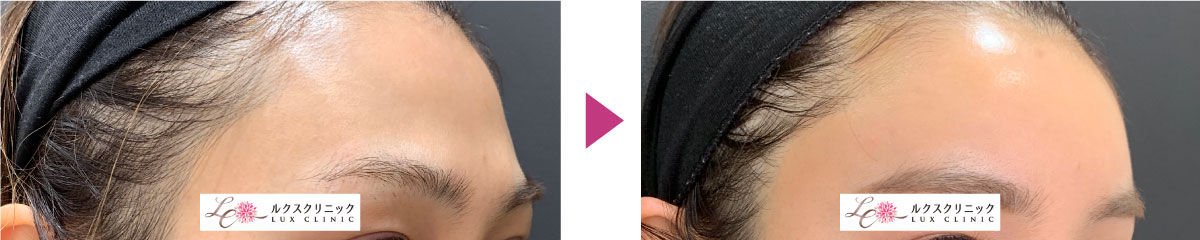 - 電車に乗った時に額に影ができて、年齢とともにゴツゴツしてきたのがお悩みでした。具体的には眉毛の上の凹みとこめかみの凹みを改善させ少し丸みを出して欲しいとの事でした。 治療は額とこめかみのコンデンスリッチ脂肪注入を行いました。 太ももから脂肪を採取し、専用の機械で脂肪を加工した上で細かく丁寧に額とこめかみに注入しました。 心配していた内出血や腫れはほぼ出なかったとのことで、大変喜んでいただけました。